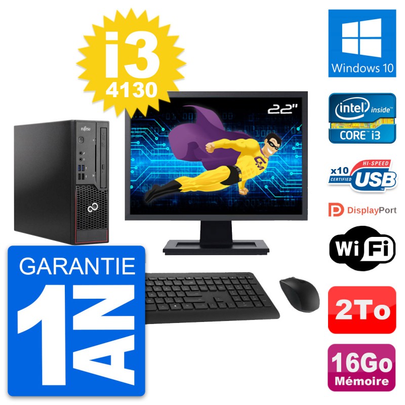 Mini PC Fujitsu C720 format SFF - Intel Core i3-4130 3.4 Ghz (3 Mo) - 16 Go DDR3 - Disque Dur 3,5" 2 To - Graveur DVD - Clef Wifi USB - Windows 10 - Livré avec Ecran 22" + clavier + souris (Marques et modèles variables) - Garantie 1 an.