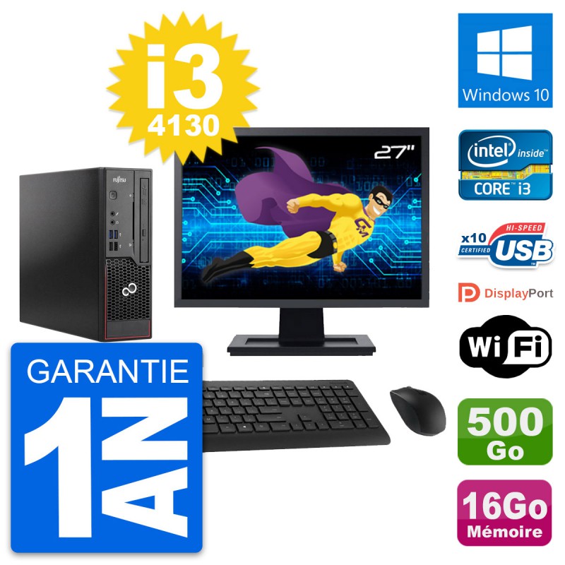 Mini PC Fujitsu C720 format SFF - Intel Core i3-4130 3.4 Ghz (3 Mo) - 16 Go DDR3 - Disque Dur 3,5" 500 Go - Graveur DVD - Clef Wifi USB - Windows 10 - Livré avec Ecran 27" + clavier + souris (Marques et modèles variables) - Garantie 1 an.