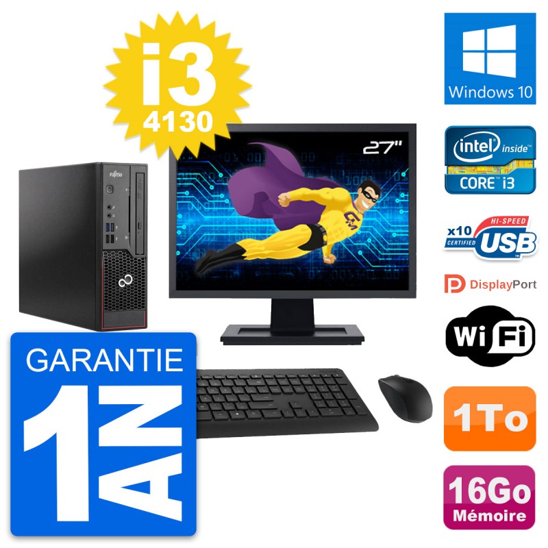 Mini PC Fujitsu C720 format SFF - Intel Core i3-4130 3.4 Ghz (3 Mo) - 16 Go DDR3 - Disque Dur 3,5" 1 To - Graveur DVD - Clef Wifi USB - Windows 10 - Livré avec Ecran 27" + clavier + souris (Marques et modèles variables) - Garantie 1 an.