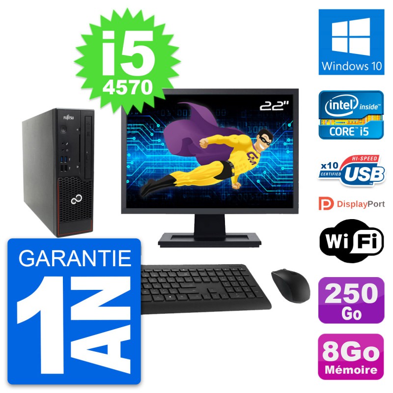 Mini PC Fujitsu C720 format SFF - Intel Core i5-4570 3.2 Ghz (6 Mo) - 8 Go DDR3 - Disque Dur 3,5" 250 Go - Graveur DVD - Clef Wifi USB - Windows 10 - Livré avec Ecran 22" + clavier + souris (Marques et modèles variables) - Garantie 1 an.