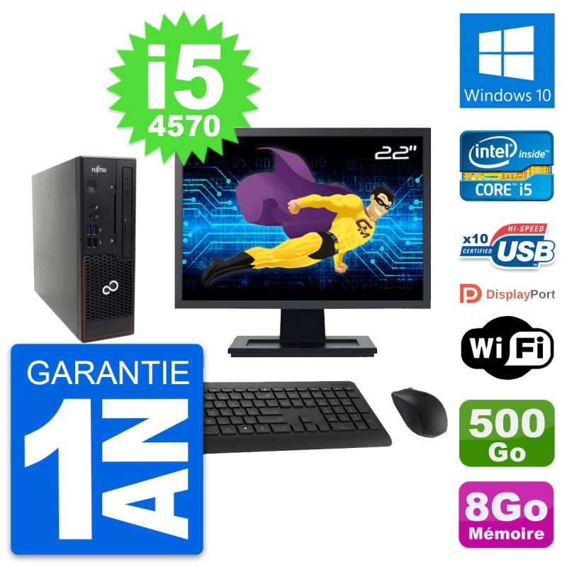 Mini PC Fujitsu C720 format SFF - Intel Core i5-4570 3.2 Ghz (6 Mo) - 8 Go DDR3 - Disque Dur 3,5" 500 Go - Graveur DVD - Clef Wifi USB - Windows 10 - Livré avec Ecran 22" + clavier + souris (Marques et modèles variables) - Garantie 1 an.