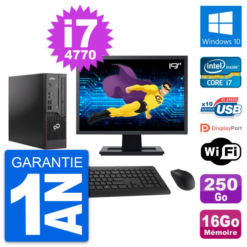 Mini PC Fujitsu C720 format SFF - Intel Core i7-4770 3.4 Ghz (8 Mo) - 16 Go DDR3 - Disque Dur 3,5" 250 Go - Graveur DVD - Clef Wifi USB - Windows 10 - Livré avec Ecran 19" + clavier + souris (Marques et modèles variables) - Garantie 1 an.
