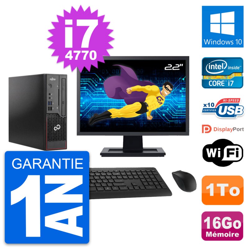 Mini PC Fujitsu C720 format SFF - Intel Core i7-4770 3.4 Ghz (8 Mo) - 16 Go DDR3 - Disque Dur 3,5" 1 To - Graveur DVD - Clef Wifi USB - Windows 10 - Livré avec Ecran 22" + clavier + souris (Marques et modèles variables) - Garantie 1 an.