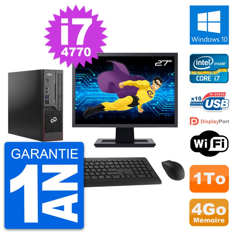 Mini PC Fujitsu C720 format SFF - Intel Core i7-4770 3.4 Ghz (8 Mo) - 4 Go DDR3 - Disque Dur 3,5" 1 To - Graveur DVD - Clef Wifi USB - Windows 10 - Livré avec Ecran 27" + clavier + souris (Marques et modèles variables) - Garantie 1 an.