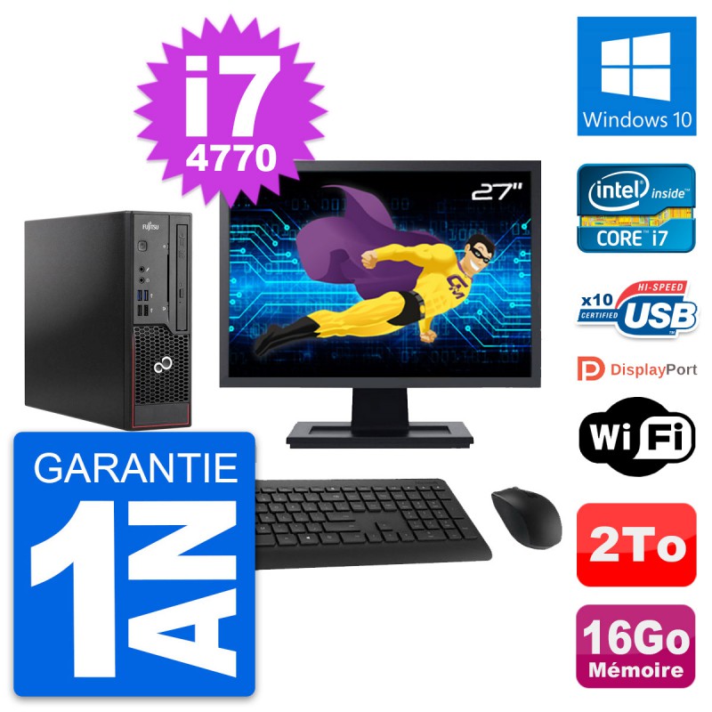 Mini PC Fujitsu C720 format SFF - Intel Core i7-4770 3.4 Ghz (8 Mo) - 16 Go DDR3 - Disque Dur 3,5" 2 To - Graveur DVD - Clef Wifi USB - Windows 10 - Livré avec Ecran 27" + clavier + souris (Marques et modèles variables) - Garantie 1 an.