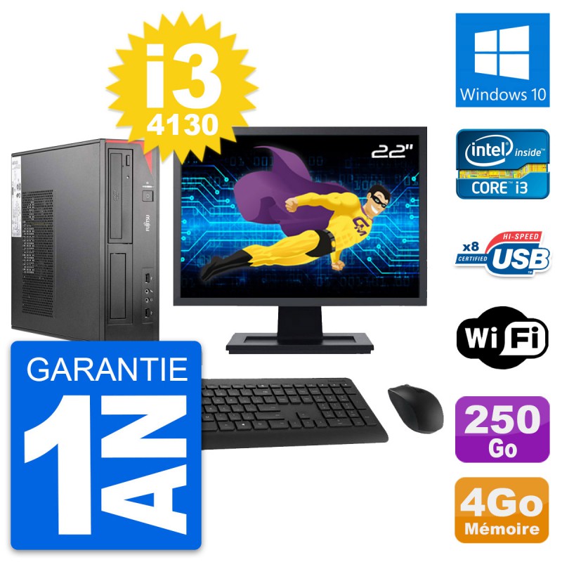 PC Fujitsu Esprimo E520 DT - Intel Core i3-4130 3.4 Ghz (3 Mo) - 4 Go DDR3 - Disque Dur 3,5" 250 Go - Graveur DVD - Clef Wifi USB - Windows 10 - Livré avec Ecran 22" + clavier + souris (Marques et modèles variables) - Garantie 1 an.