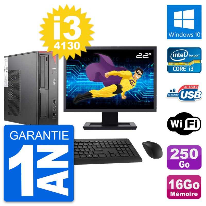PC Fujitsu Esprimo E520 DT - Intel Core i3-4130 3.4 Ghz (3 Mo) - 16 Go DDR3 - Disque Dur 3,5" 250 Go - Graveur DVD - Clef Wifi USB - Windows 10 - Livré avec Ecran 22" + clavier + souris (Marques et modèles variables) - Garantie 1 an.