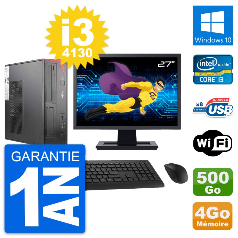 PC Fujitsu Esprimo E520 DT - Intel Core i3-4130 3.4 Ghz (3 Mo) - 4 Go DDR3 - Disque Dur 3,5" 500 Go - Graveur DVD - Clef Wifi USB - Windows 10 - Livré avec Ecran 27" + clavier + souris (Marques et modèles variables) - Garantie 1 an.