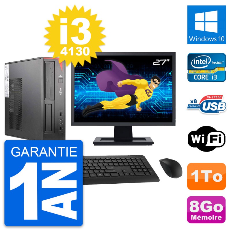 PC Fujitsu Esprimo E520 DT - Intel Core i3-4130 3.4 Ghz (3 Mo) - 8 Go DDR3 - Disque Dur 3,5" 1 To - Graveur DVD - Clef Wifi USB - Windows 10 - Livré avec Ecran 27" + clavier + souris (Marques et modèles variables) - Garantie 1 an.