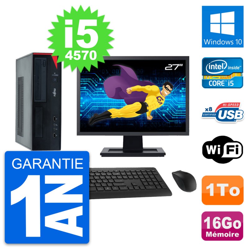PC Fujitsu Esprimo E520 DT - Intel Core i5-4570 3.2 Ghz (6 Mo) - 16 Go DDR3 - Disque Dur 3,5" 1 To - Graveur DVD - Clef Wifi USB - Windows 10 - Livré avec Ecran 27" + clavier + souris (Marques et modèles variables) - Garantie 1 an.
