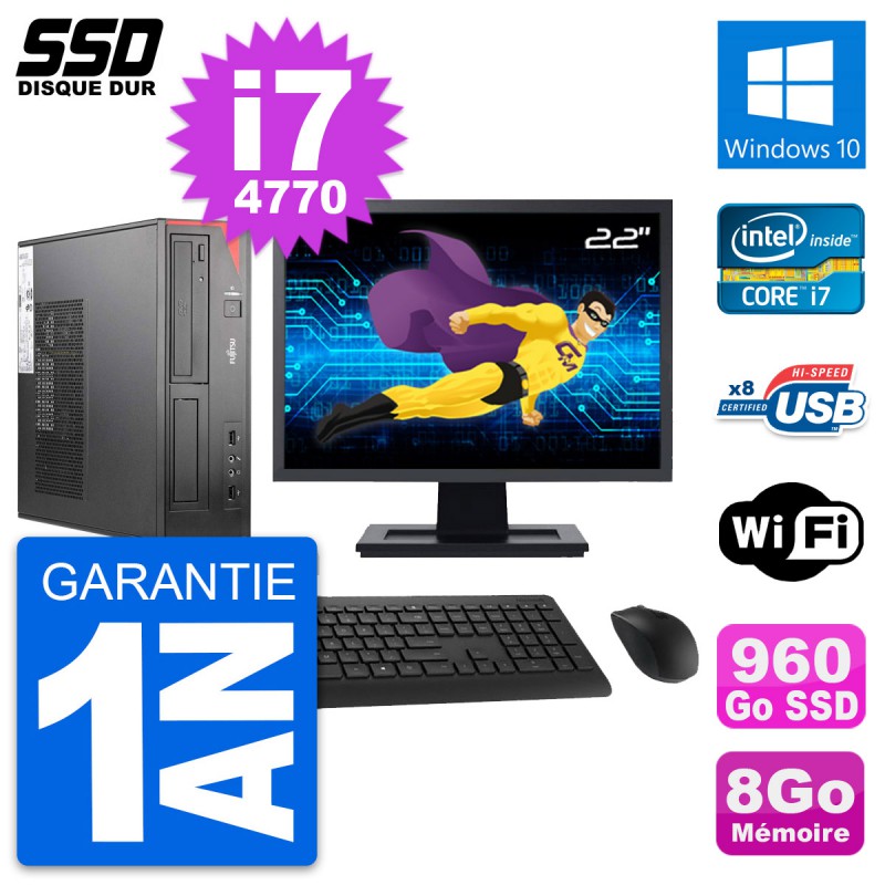 PC Fujitsu Esprimo E520 DT - Intel Core i7-4770 3.4 Ghz (8 Mo)- 8 Go DDR3 - Disque Dur SSD 960 Go - Graveur DVD - Clef Wifi USB - Windows 10 - Livré avec Ecran 22" + clavier + souris (Marques et modèles variables) - Garantie 1 an.