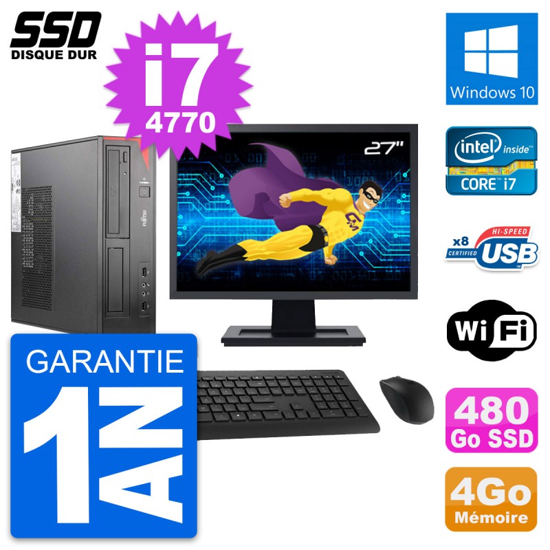PC Fujitsu Esprimo E520 DT - Intel Core i7-4770 3.4 Ghz (8 Mo)- 4 Go DDR3 - Disque Dur SSD 480 Go - Graveur DVD - Clef Wifi USB - Windows 10 - Livré avec Ecran 27" + clavier + souris (Marques et modèles variables) - Garantie 1 an.