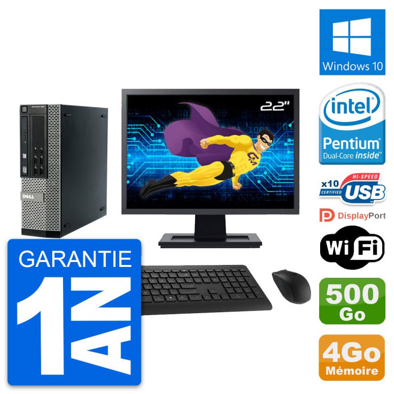 PC Dell 990 SFF - Intel Pentium Dual-Core G840 2.8 Ghz (3 Mo) - 4 Go DDR3 - Disque Dur 3,5" 500 Go - Graveur DVD - Clef Wifi USB - Windows 10 - Livré avec Ecran 22" + clavier + souris (Marques et modèles variables) - Garantie 1 an.