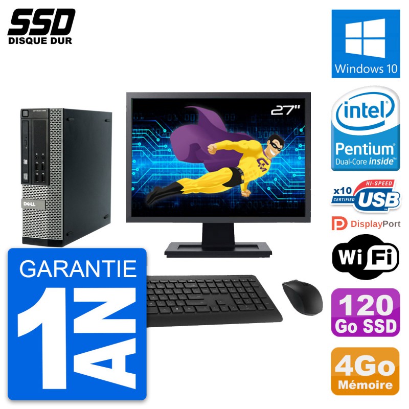 PC Dell 990 SFF - Intel Pentium Dual-Core G840 2.8 Ghz (3 Mo) - 4 Go DDR3 - Disque Dur SSD 120 Go - Graveur DVD - Clef Wifi USB - Windows 10 - Livré avec Ecran 27" + clavier + souris (Marques et modèles variables) - Garantie 1 an.