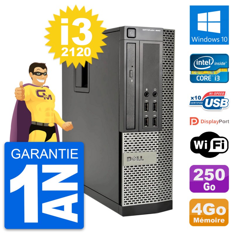 PC Dell OptiPlex 990 SFF - Intel Core i3-2120 3.3 Ghz (3 Mo) - 4 Go DDR3 - Disque Dur 3,5" 250 Go - Graveur DVD - Clef Wifi USB - Windows 10 - Garantie 1 an.