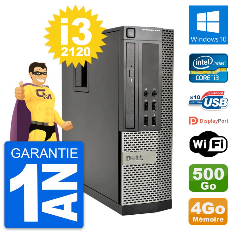 PC Dell OptiPlex 990 SFF - Intel Core i3-2120 3.3 Ghz (3 Mo) - 4 Go DDR3 - Disque Dur 3,5" 500 Go - Graveur DVD - Clef Wifi USB - Windows 10 - Garantie 1 an.