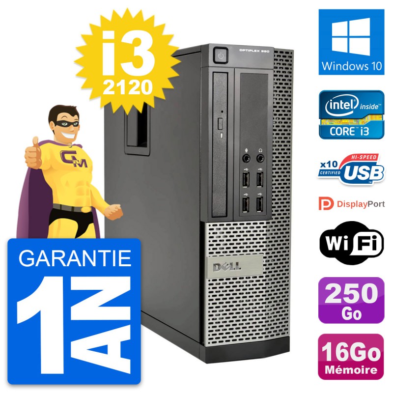 PC Dell OptiPlex 990 SFF - Intel Core i3-2120 3.3 Ghz (3 Mo) - 16 Go DDR3 - Disque Dur 3,5" 250 Go - Graveur DVD - Clef Wifi USB - Windows 10 - Garantie 1 an.
