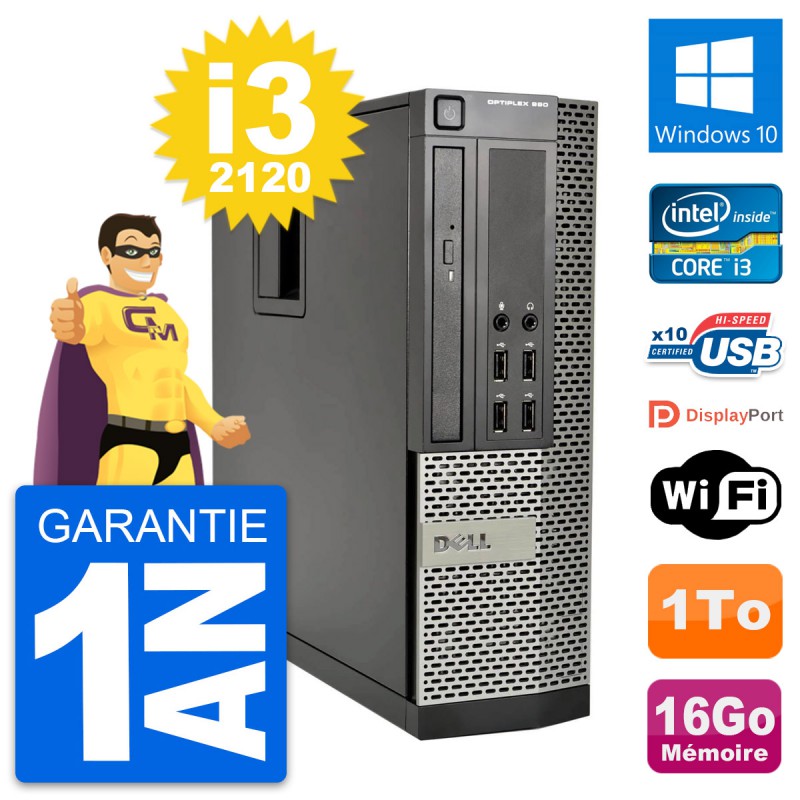 PC Dell OptiPlex 990 SFF - Intel Core i3-2120 3.3 Ghz (3 Mo) - 16 Go DDR3 - Disque Dur 3,5" 1 To - Graveur DVD - Clef Wifi USB - Windows 10 - Garantie 1 an.