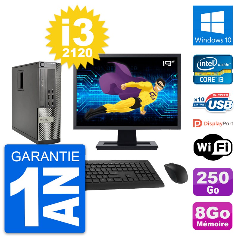 PC Dell 990 SFF - Intel Core i3-2120 3.3 Ghz (3 Mo) - 8 Go DDR3 - Disque Dur 3,5" 250 Go - Graveur DVD - Clef Wifi USB - Windows 10 - Livré avec Ecran 19" + clavier + souris (Marques et modèles variables) - Garantie 1 an.