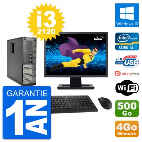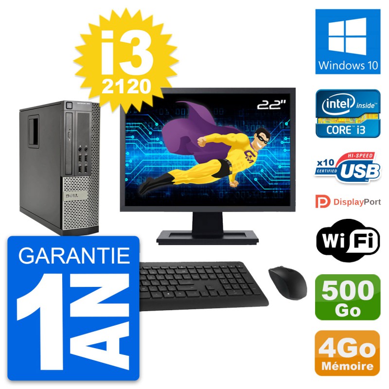 PC Dell 990 SFF - Intel Core i3-2120 3.3 Ghz (3 Mo) - 4 Go DDR3 - Disque Dur 3,5" 500 Go - Graveur DVD - Clef Wifi USB - Windows 10 - Livré avec Ecran 22" + clavier + souris (Marques et modèles variables) - Garantie 1 an.