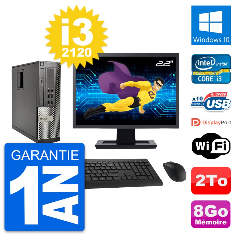 PC Dell 990 SFF - Intel Core i3-2120 3.3 Ghz (3 Mo) - 8 Go DDR3 - Disque Dur 3,5" 2 To - Graveur DVD - Clef Wifi USB - Windows 10 - Livré avec Ecran 22" + clavier + souris (Marques et modèles variables) - Garantie 1 an.