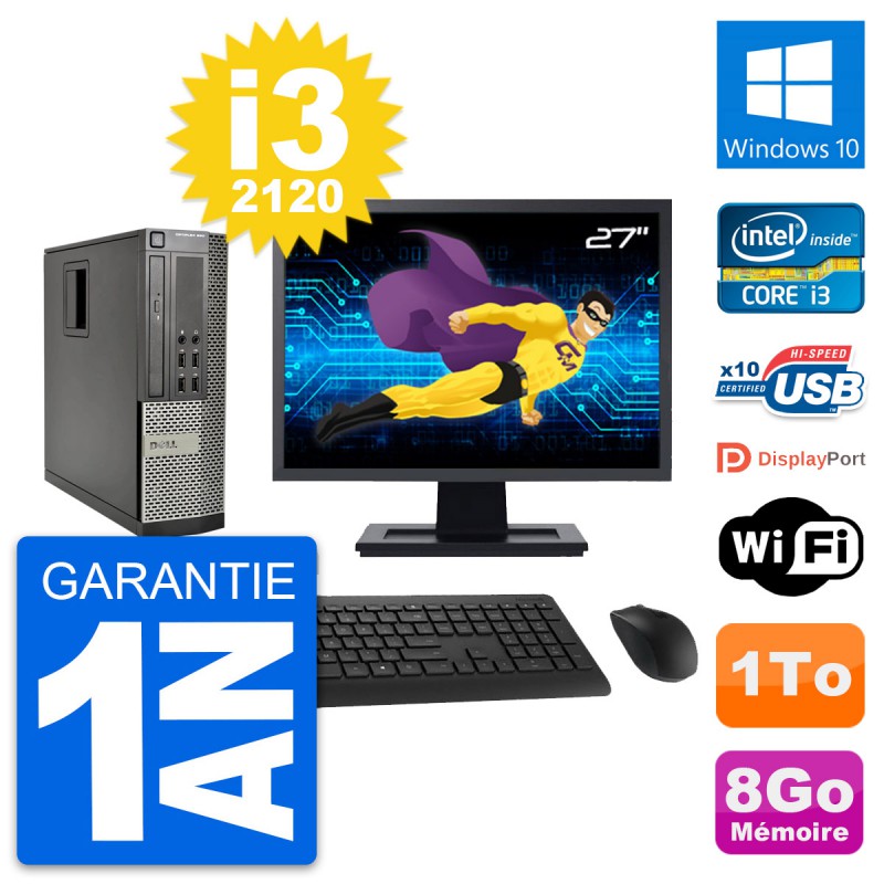 PC Dell 990 SFF - Intel Core i3-2120 3.3 Ghz (3 Mo) - 8 Go DDR3 - Disque Dur 3,5" 1 To - Graveur DVD - Clef Wifi USB - Windows 10 - Livré avec Ecran 27" + clavier + souris (Marques et modèles variables) - Garantie 1 an.