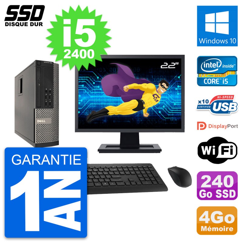 PC Dell 990 SFF - Intel Core i5-2400 3.1 Ghz (6 Mo) - 4 Go DDR3 - Disque Dur SSD 240 Go - Graveur DVD - Clef Wifi USB - Windows 10 - Livré avec Ecran 22" + clavier + souris (Marques et modèles variables) - Garantie 1 an.
