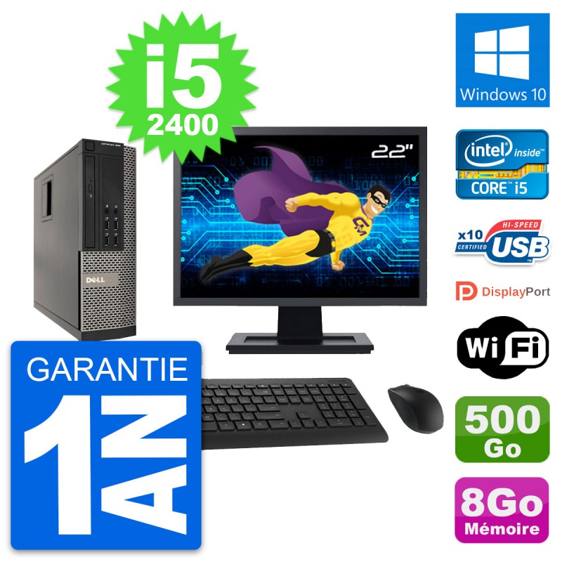 PC Dell 990 SFF - Intel Core i5-2400 3.1 Ghz (6 Mo) - 8 Go DDR3 - Disque Dur 3,5" 500 Go - Graveur DVD - Clef Wifi USB - Windows 10 - Livré avec Ecran 22" + clavier + souris (Marques et modèles variables) - Garantie 1 an.