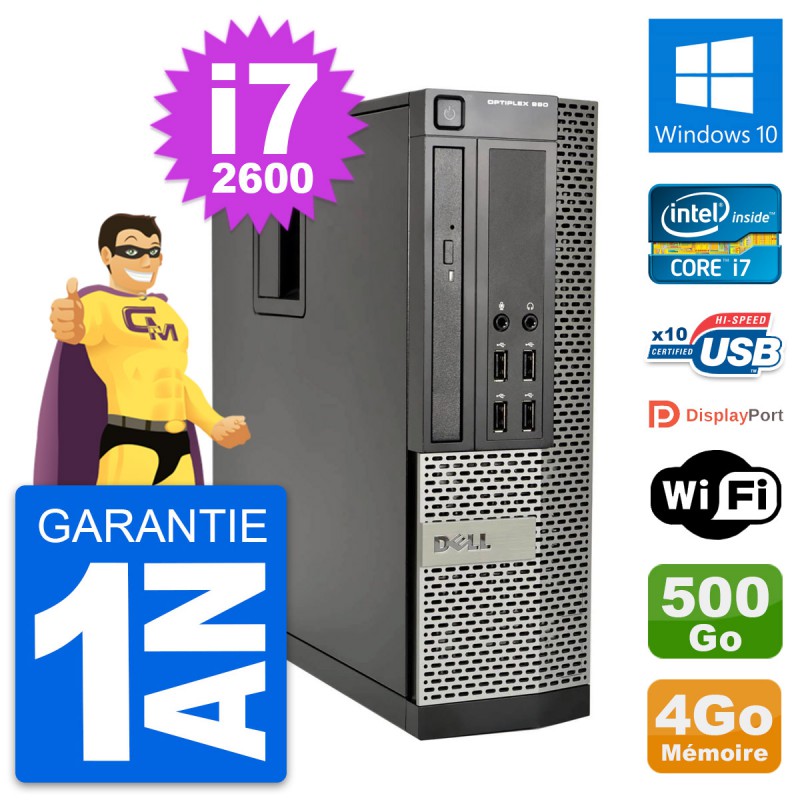 PC Dell OptiPlex 990 SFF - Intel Core i7-2600 3.4 Ghz (8 Mo) - 4 Go DDR3 - Disque Dur 3,5" 500 Go - Graveur DVD - Clef Wifi USB - Windows 10 - Garantie 1 an.