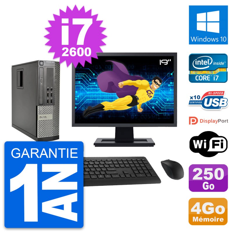 PC Dell 990 SFF - Intel Core i7-2600 3.4 Ghz (8 Mo) - 4 Go DDR3 - Disque Dur 3,5" 250 Go - Graveur DVD - Clef Wifi USB - Windows 10 - Livré avec Ecran 19" + clavier + souris (Marques et modèles variables) - Garantie 1 an.