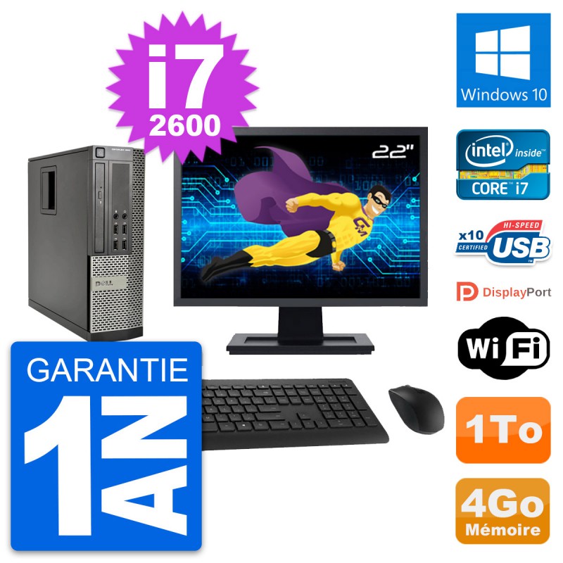 PC Dell 990 SFF - Intel Core i7-2600 3.4 Ghz (8 Mo) - 4 Go DDR3 - Disque Dur 3,5" 1 To - Graveur DVD - Clef Wifi USB - Windows 10 - Livré avec Ecran 22" + clavier + souris (Marques et modèles variables) - Garantie 1 an.