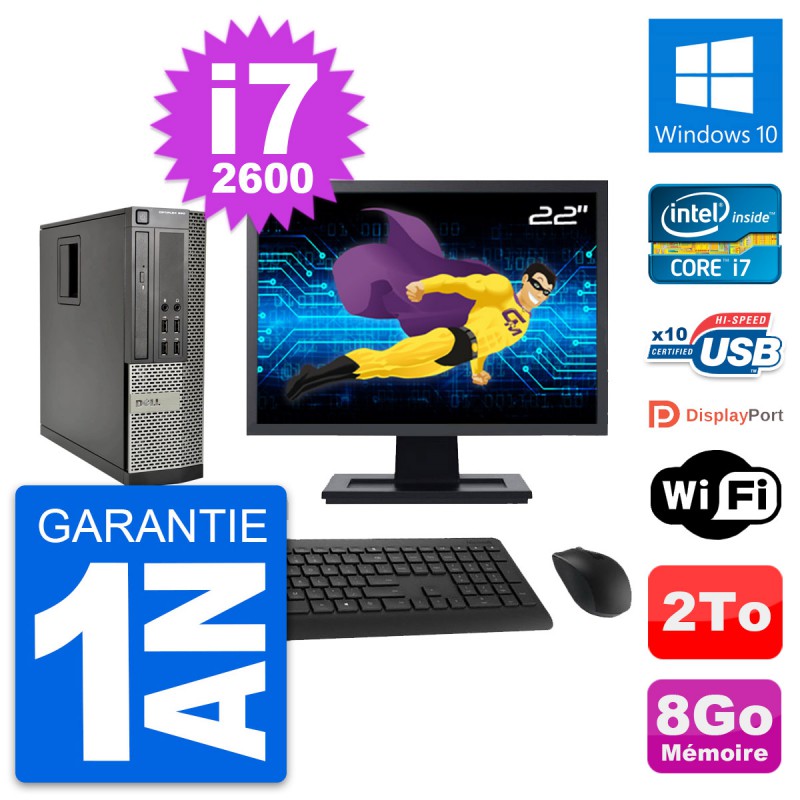 PC Dell 990 SFF - Intel Core i7-2600 3.4 Ghz (8 Mo) - 8 Go DDR3 - Disque Dur 3,5" 2 To - Graveur DVD - Clef Wifi USB - Windows 10 - Livré avec Ecran 22" + clavier + souris (Marques et modèles variables) - Garantie 1 an.