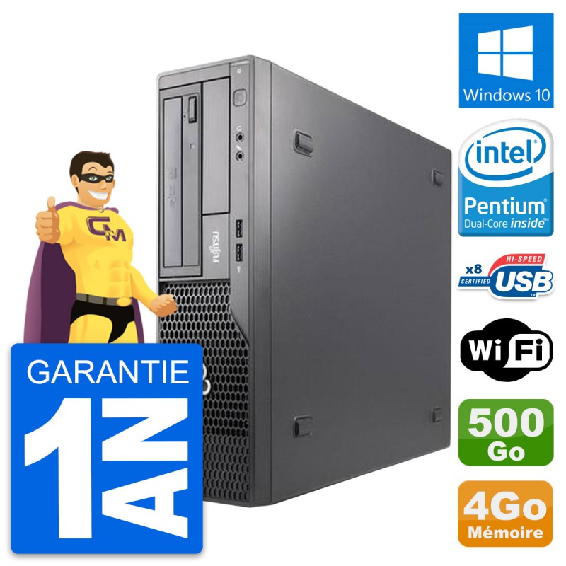 PC Fujitsu Esprimo E500 DT - Intel Pentium Dual-Core G630 2.7 Ghz (3 Mo) - 4 Go DDR3 - Disque Dur 3,5" 500 Go - Graveur DVD - Clef Wifi USB - Windows 10 - Garantie 1 an.