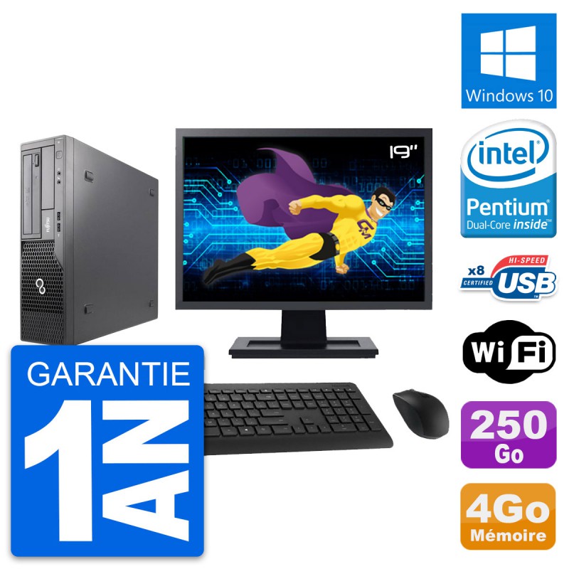 PC Fujitsu E500 DT - Intel Pentium Dual-Core G630 2.7 Ghz (3 Mo) - 4 Go DDR3 - Disque Dur 3,5" 250 Go - Graveur DVD - Clef Wifi USB - Windows 10 - Livré avec Ecran 19" + clavier + souris (Marques et modèles variables) - Garantie 1 an.