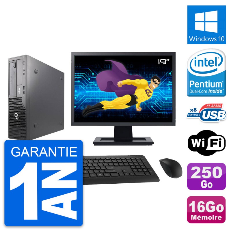 PC Fujitsu E500 DT - Intel Pentium Dual-Core G630 2.7 Ghz (3 Mo) - 16 Go DDR3 - Disque Dur 3,5" 250 Go - Graveur DVD - Clef Wifi USB - Windows 10 - Livré avec Ecran 19" + clavier + souris (Marques et modèles variables) - Garantie 1 an.