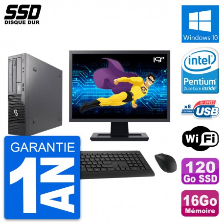 PC Fujitsu E500 DT - Intel Pentium Dual-Core G630 2.7 Ghz (3 Mo) - 16 Go DDR3 - Disque Dur SSD 120 Go - Graveur DVD - Clef Wifi USB - Windows 10 - Livré avec Ecran 19" + clavier + souris (Marques et modèles variables) - Garantie 1 an.