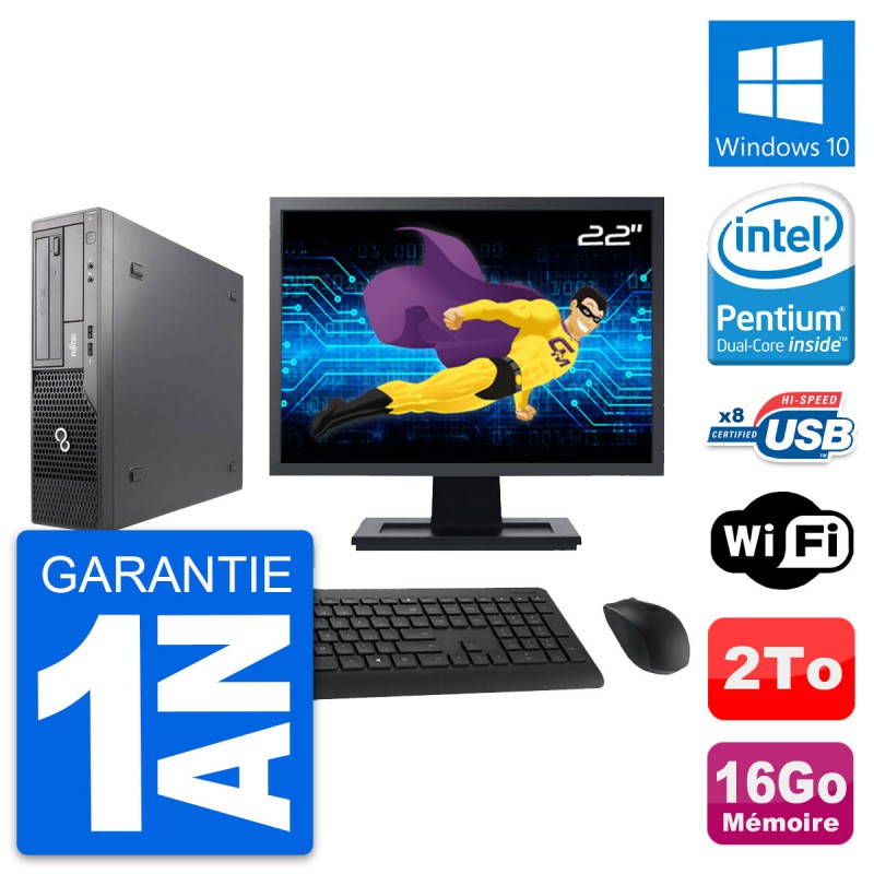 PC Fujitsu E500 DT - Intel Pentium Dual-Core G630 2.7 Ghz (3 Mo) - 16 Go DDR3 - Disque Dur 3,5" 2 To - Graveur DVD - Clef Wifi USB - Windows 10 - Livré avec Ecran 22" + clavier + souris (Marques et modèles variables) - Garantie 1 an.
