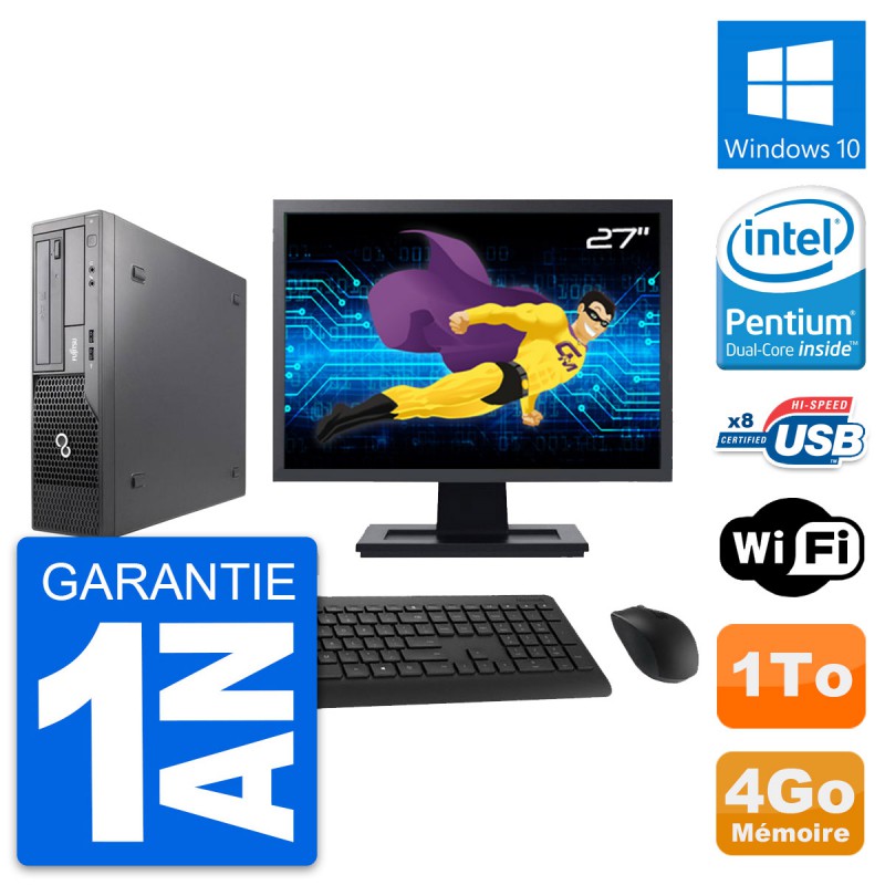 PC Fujitsu E500 DT - Intel Pentium Dual-Core G630 2.7 Ghz (3 Mo) - 4 Go DDR3 - Disque Dur 3,5" 1 To - Graveur DVD - Clef Wifi USB - Windows 10 - Livré avec Ecran 27" + clavier + souris (Marques et modèles variables) - Garantie 1 an.