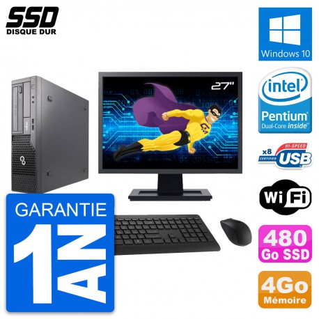 PC Fujitsu E500 DT - Intel Pentium Dual-Core G630 2.7 Ghz (3 Mo) - 4 Go DDR3 - Disque Dur SSD 480 Go - Graveur DVD - Clef Wifi USB - Windows 10 - Livré avec Ecran 27" + clavier + souris (Marques et modèles variables) - Garantie 1 an.