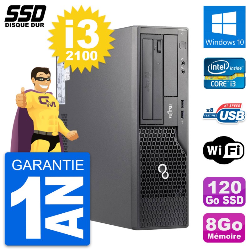 PC Fujitsu Esprimo E500 DT - Intel Core i3-2100 3.1 Ghz (3 Mo) - 8 Go DDR3 - Disque Dur SSD 120 Go - Graveur DVD - Clef Wifi USB - Windows 10 - Garantie 1 an.