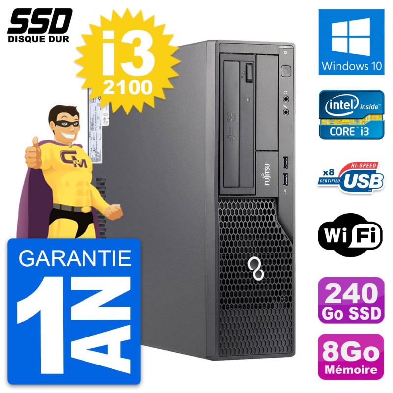 PC Fujitsu Esprimo E500 DT - Intel Core i3-2100 3.1 Ghz (3 Mo) - 8 Go DDR3 - Disque Dur SSD 240 Go - Graveur DVD - Clef Wifi USB - Windows 10 - Garantie 1 an.