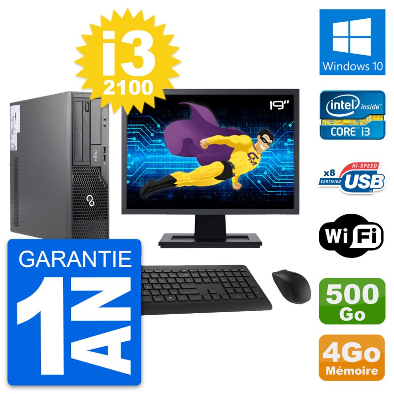 PC Fujitsu E500 DT - Intel Core i3-2100 3.1 Ghz (3 Mo) - 4 Go DDR3 - Disque Dur 3,5" 500 Go - Graveur DVD - Clef Wifi USB - Windows 10 - Livré avec Ecran 19" + clavier + souris (Marques et modèles variables) - Garantie 1 an.