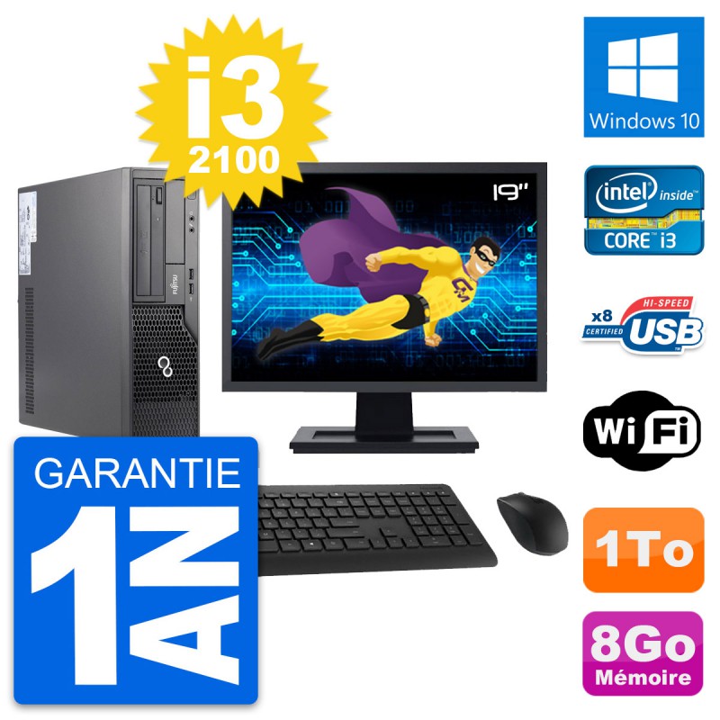 PC Fujitsu E500 DT - Intel Core i3-2100 3.1 Ghz (3 Mo) - 8 Go DDR3 - Disque Dur 3,5" 1 To - Graveur DVD - Clef Wifi USB - Windows 10 - Livré avec Ecran 19" + clavier + souris (Marques et modèles variables) - Garantie 1 an.