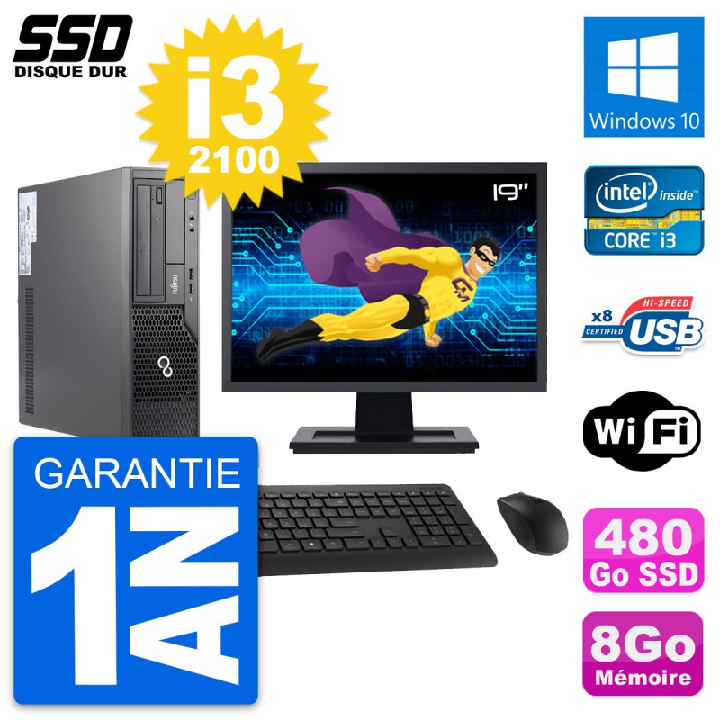PC Fujitsu E500 DT - Intel Core i3-2100 3.1 Ghz (3 Mo) - 8 Go DDR3 - Disque Dur SSD 480 Go - Graveur DVD - Clef Wifi USB - Windows 10 - Livré avec Ecran 19" + clavier + souris (Marques et modèles variables) - Garantie 1 an.