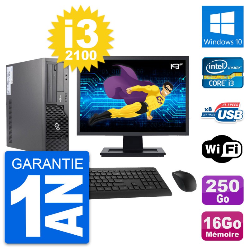 PC Fujitsu E500 DT - Intel Core i3-2100 3.1 Ghz (3 Mo) - 16 Go DDR3 - Disque Dur 3,5" 250 Go - Graveur DVD - Clef Wifi USB - Windows 10 - Livré avec Ecran 19" + clavier + souris (Marques et modèles variables) - Garantie 1 an.