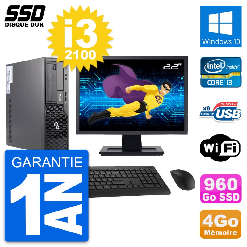 PC Fujitsu E500 DT - Intel Core i3-2100 3.1 Ghz (3 Mo) - 4 Go DDR3 - Disque Dur SSD 960 Go - Graveur DVD - Clef Wifi USB - Windows 10 - Livré avec Ecran 22" + clavier + souris (Marques et modèles variables) - Garantie 1 an.