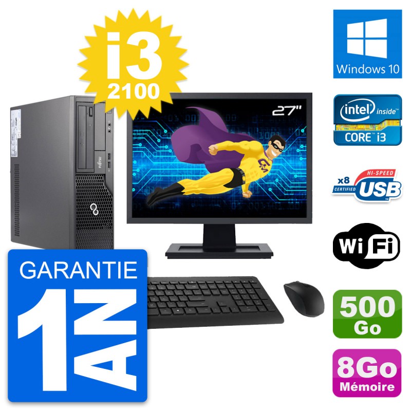 PC Fujitsu E500 DT - Intel Core i3-2100 3.1 Ghz (3 Mo) - 8 Go DDR3 - Disque Dur 3,5" 500 Go - Graveur DVD - Clef Wifi USB - Windows 10 - Livré avec Ecran 27" + clavier + souris (Marques et modèles variables) - Garantie 1 an.