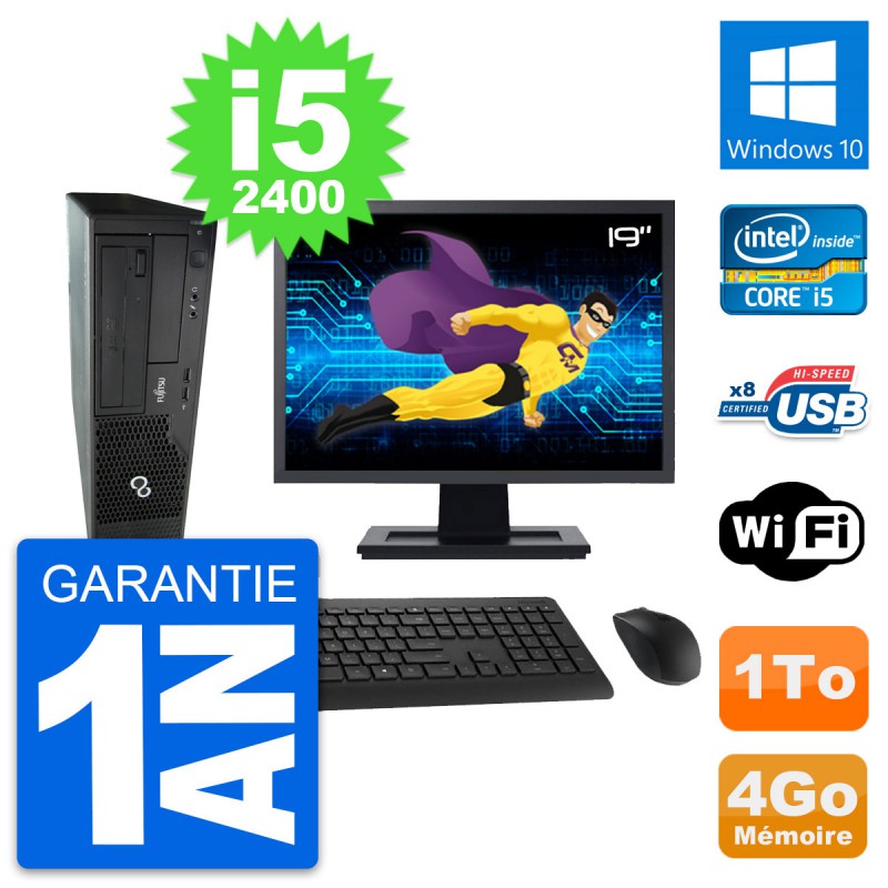 PC Fujitsu E500 DT - Intel Core i5-2400 3.1 Ghz (6 Mo) - 4 Go DDR3 - Disque Dur 3,5" 1 To - Graveur DVD - Clef Wifi USB - Windows 10 - Livré avec Ecran 19" + clavier + souris (Marques et modèles variables) - Garantie 1 an.