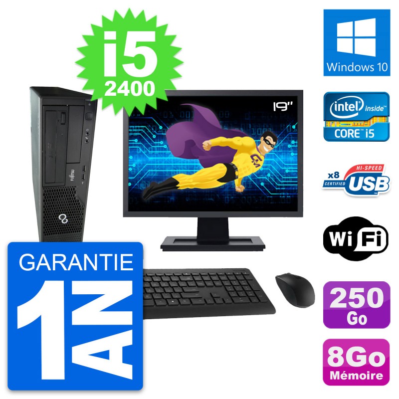 PC Fujitsu E500 DT - Intel Core i5-2400 3.1 Ghz (6 Mo) - 8 Go DDR3 - Disque Dur 3,5" 250 Go - Graveur DVD - Clef Wifi USB - Windows 10 - Livré avec Ecran 19" + clavier + souris (Marques et modèles variables) - Garantie 1 an.