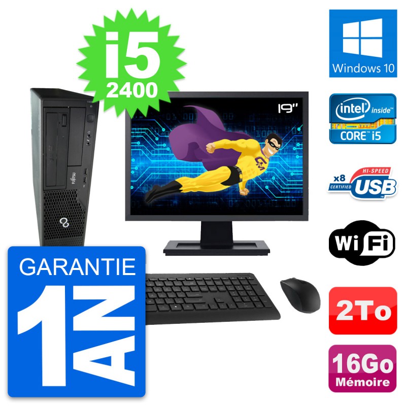 PC Fujitsu E500 DT - Intel Core i5-2400 3.1 Ghz (6 Mo) - 16 Go DDR3 - Disque Dur 3,5" 2 To - Graveur DVD - Clef Wifi USB - Windows 10 - Livré avec Ecran 19" + clavier + souris (Marques et modèles variables) - Garantie 1 an.